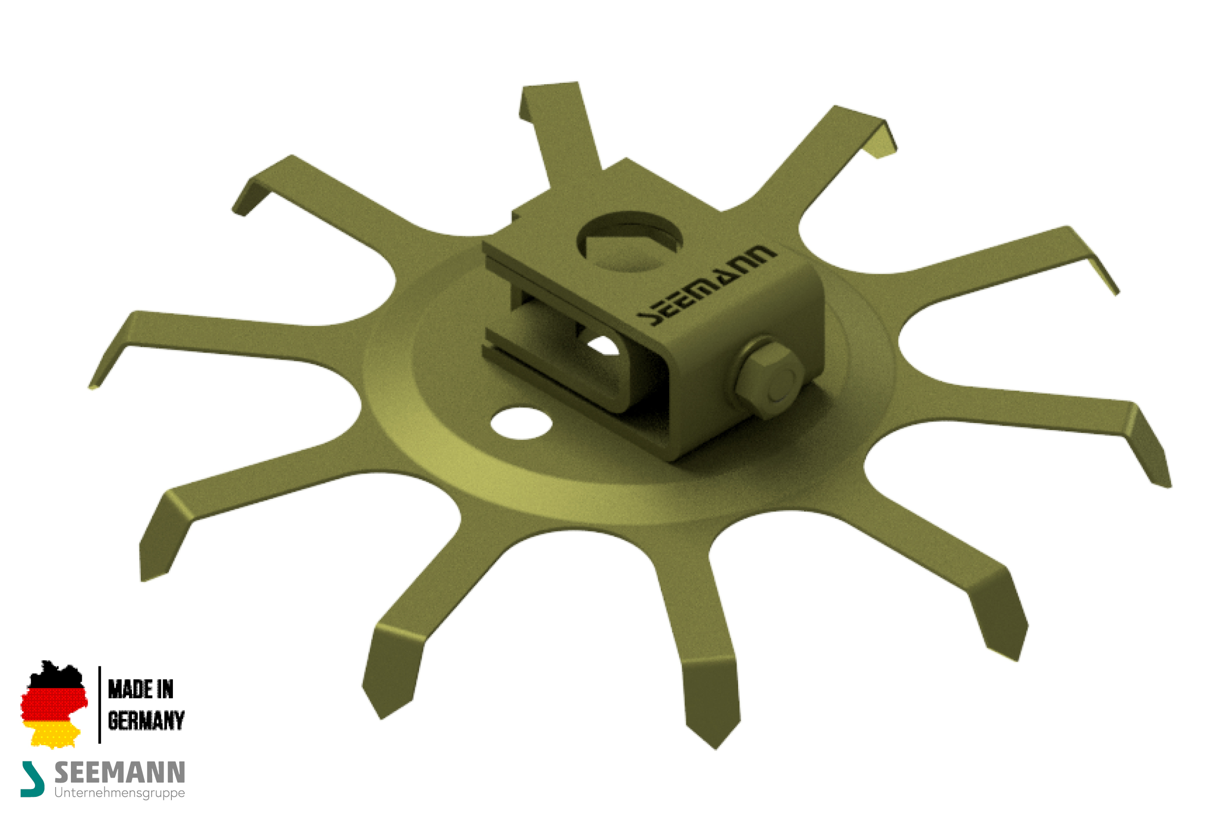 Titan-Stanzteller mit 10 Kontakten inklusive verschweißtem Flansch zur Befestigung. Der Teller ist geeignet für Eloxal- und Elektropolierverfahren.